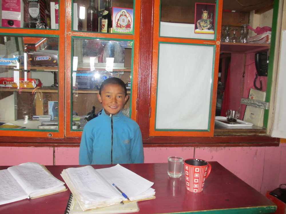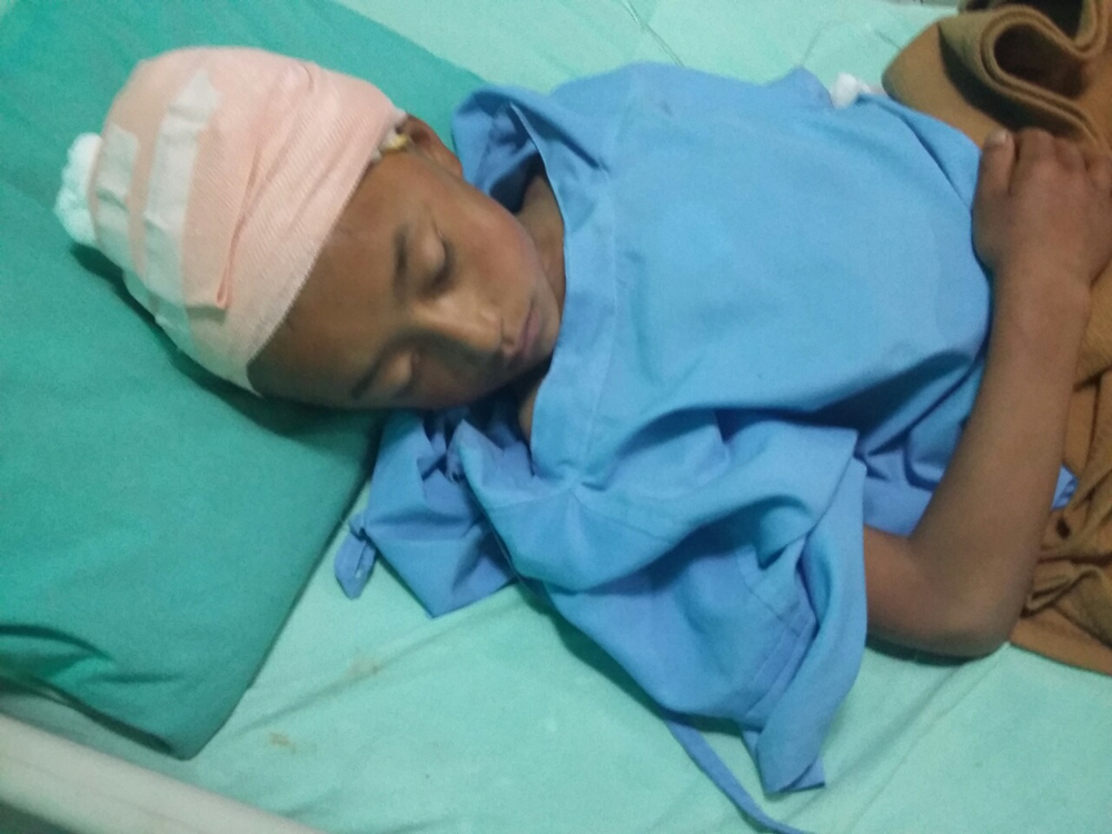Der kleine Junge Dawa (12 Jahre aus Lukla, Nepal) wurde beim 2. großen Erdbeben am 13. Mai 2015 von einem herunterstürzenden Stein am Kopf getroffen .